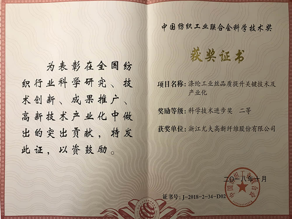 中國紡織工業(yè)聯(lián)合會科學(xué)技術(shù)獎二等獎2018.10